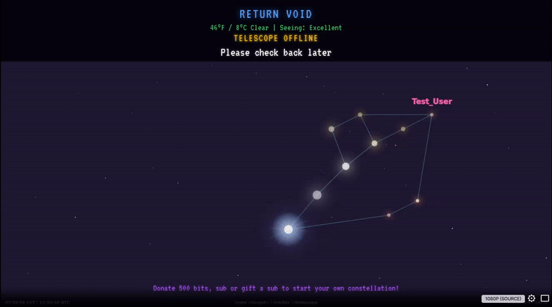 I continued looking for ways to make this a gamified experience. Eventually I came up with the idea that viewers could draw their own constellations if they donated at the right minute and second using the donation/subscription timestamp. The minute within the hour you donated would dictate the vertical placement of the star and the hour you donated would simply dictate the horizontal placement over time.