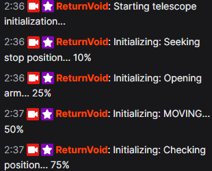 I had finally completed what I set out to do. I had a telescope automatically controlled by Twitch chat commands, and an OBS WebSocket connected to switch between overlays depending on the current state of the telescope.