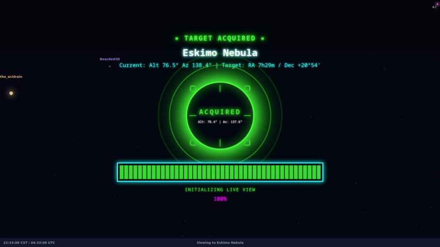 I now run a fully automated Twitch stream where anyone can watch and interact with my Vespera II telescope. Subscribers or donors can vote on targets. The overlay shows real-time data and a retro loading screen. Music plays in the background and changes its volume depending on what time of day/night it is. Constellations drift across the screen bearing the names of supporters.