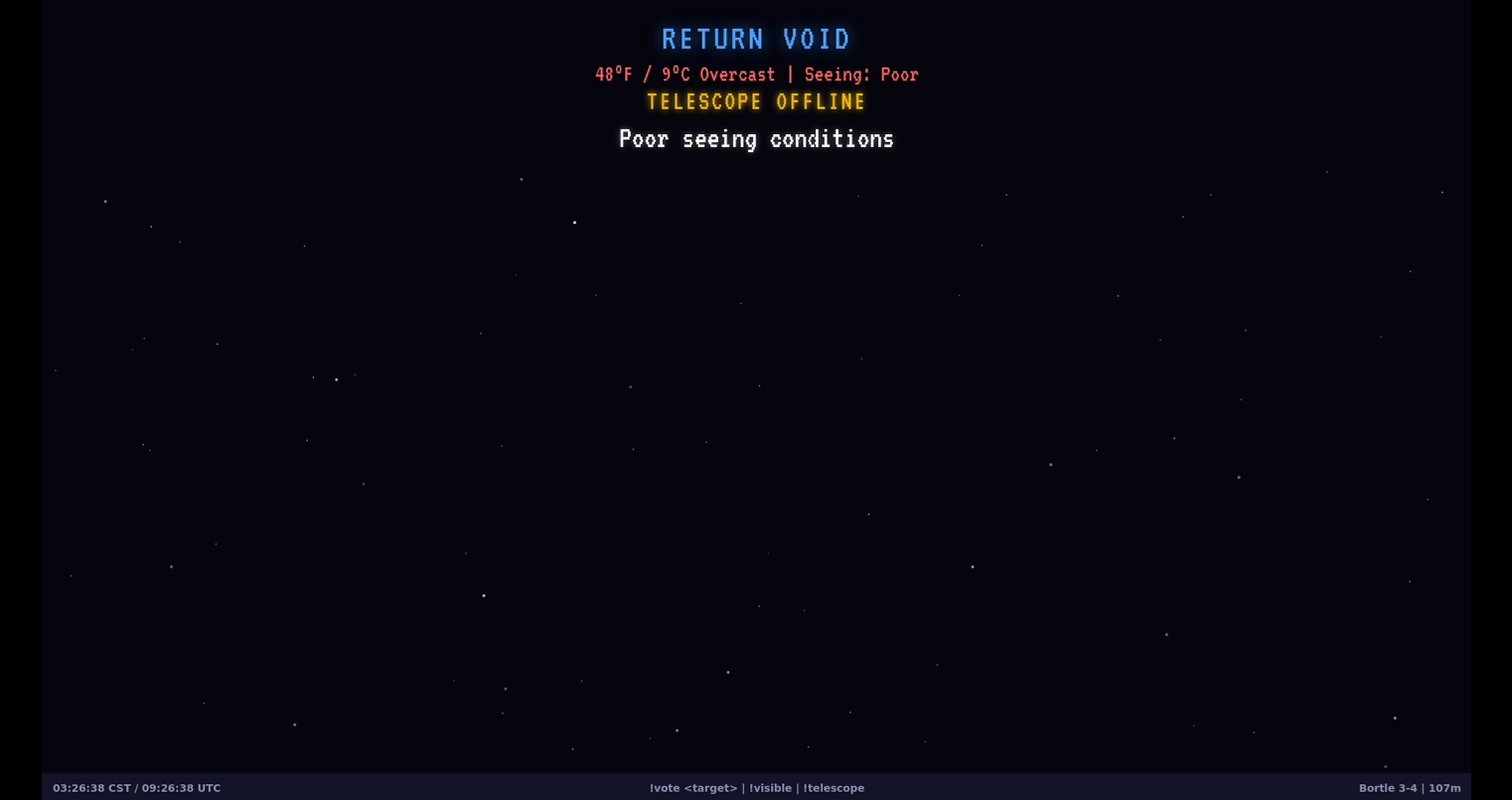 Return Void streams live at https://twitch.tv/returnvoid whenever the skies are clear and the telescope is awake. Come say hi, vote for your favorite galaxy, and maybe earn your own constellation among the stars.